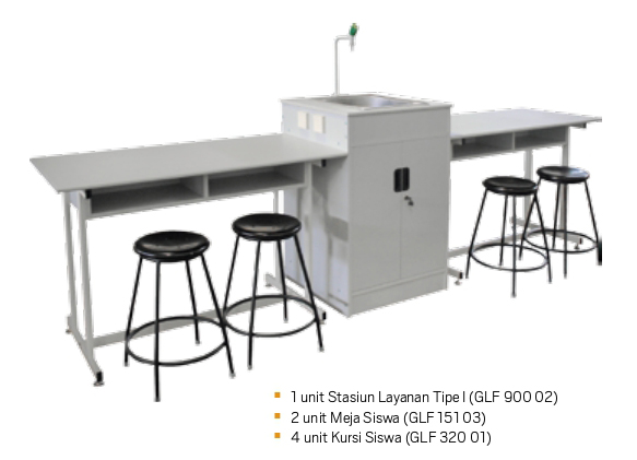 Beberapa furnitur utama di dalam ruang laboratorium adalah meja kerja siswa, tempat duduk siswa, meja demonstrasi, dan lemari alat dan bahan.